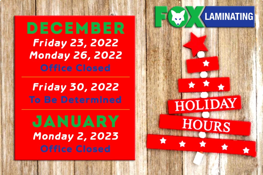 Please review our updated holiday hours and plan ahead. We’re taking some much-needed time with our loved ones. We will return on Tuesday. Happy Holidays from Fox Laminating Company!
